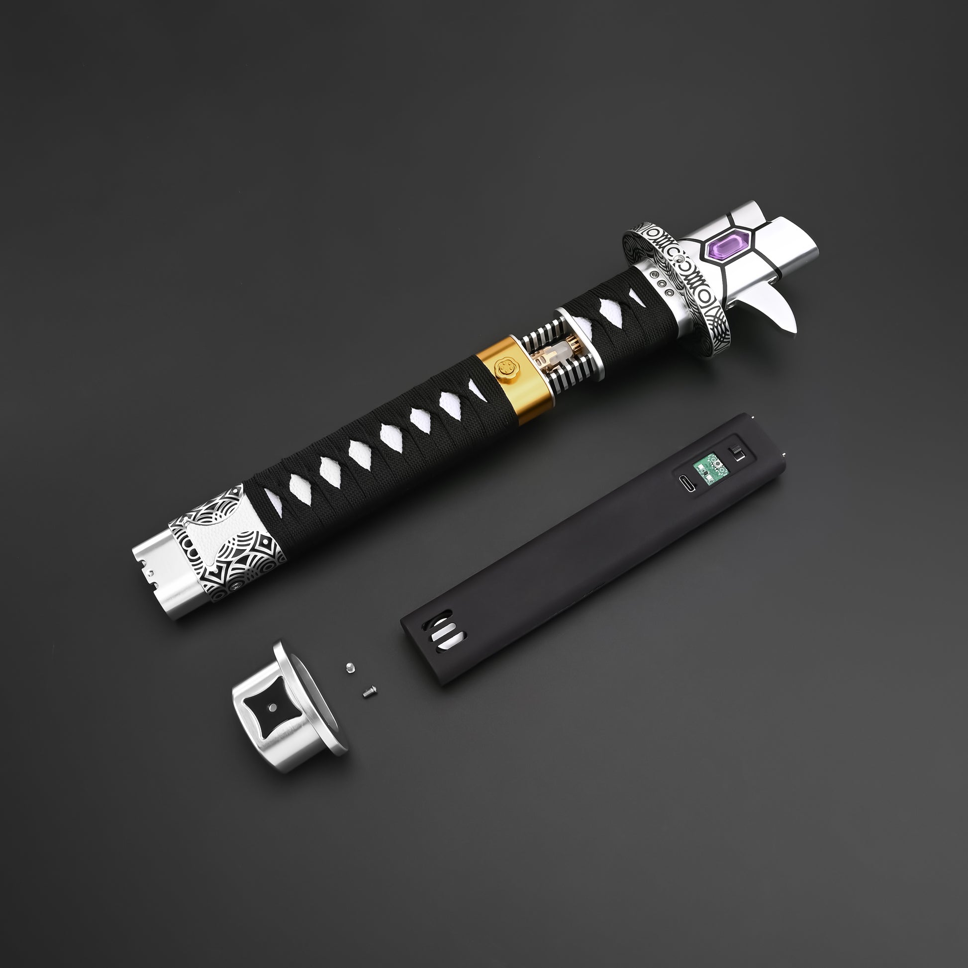 The hilt features a hand-bound tsuka-ito wrap, delivering authentic grip and tactile control. An exposed kyber crystal chamber glows through the hilt’s spine, while an inlaid purple crystal in the emitter adds a regal accent of light. Each saber includes an exclusive, matching scabbard—completing the look and paying tribute to the ancient weaponry that inspired it.